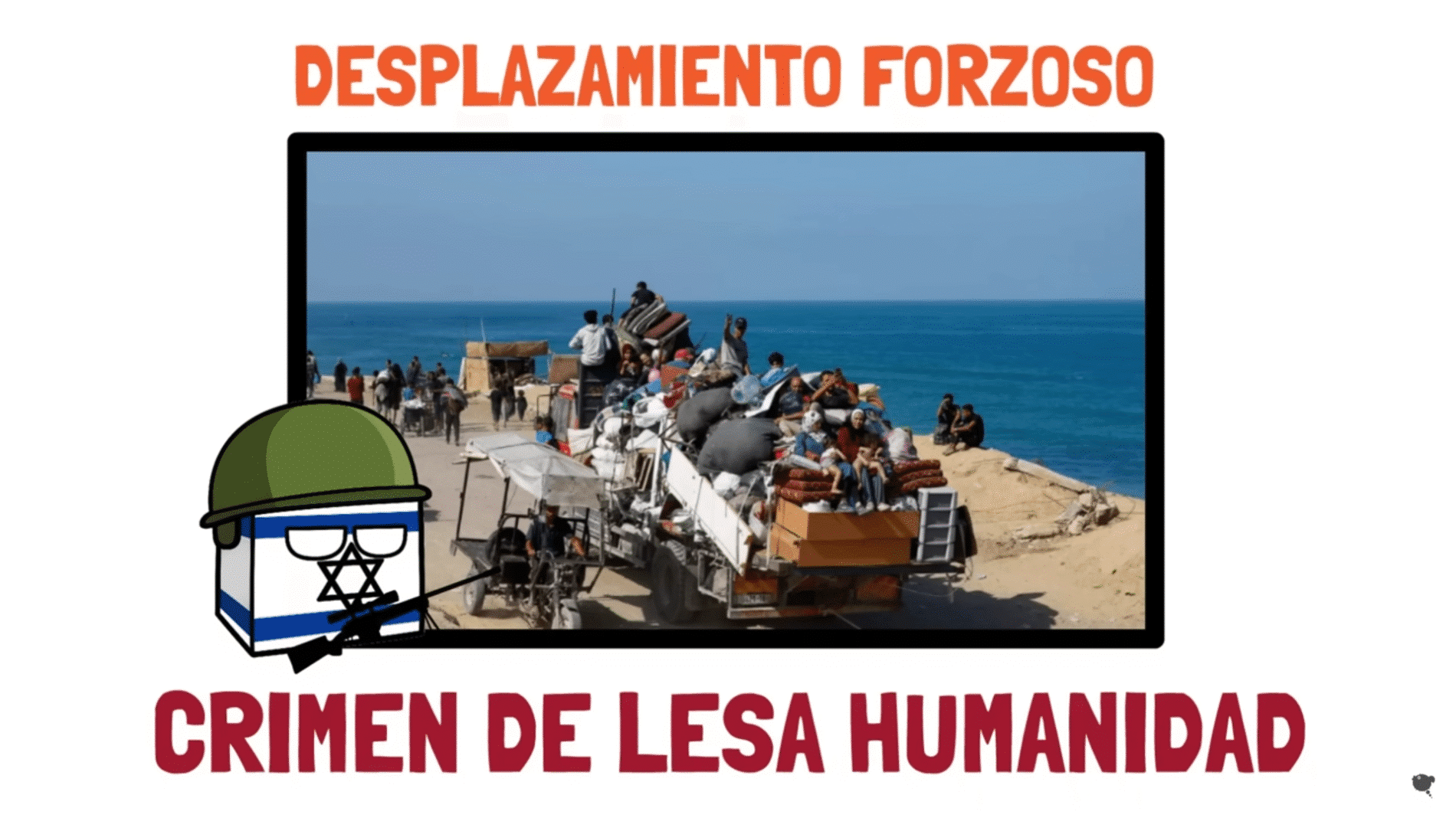 De los bombardeos ya hemos hablado antes, pero ¿qué dice Israel sobre los desplazamientos forzosos? Pues básicamente, Israel dice que no expulsa a la población, sino que ordena evacuaciones temporales para proteger a los civiles de los combates. Según su versión, mover a la gente no es un crimen, sino una medida humanitaria para alejarlos de las zonas de alto riesgo. El problema es que en Gaza cientos de miles de personas han sido desplazadas sin garantías reales de refugio, sin agua ni comida suficientes y sin posibilidad de regresar a sus hogares. Bajo esas condiciones, lo que Israel presenta como protección se interpreta más bien como una forma de castigo colectivo y un crimen de lesa humanidad.