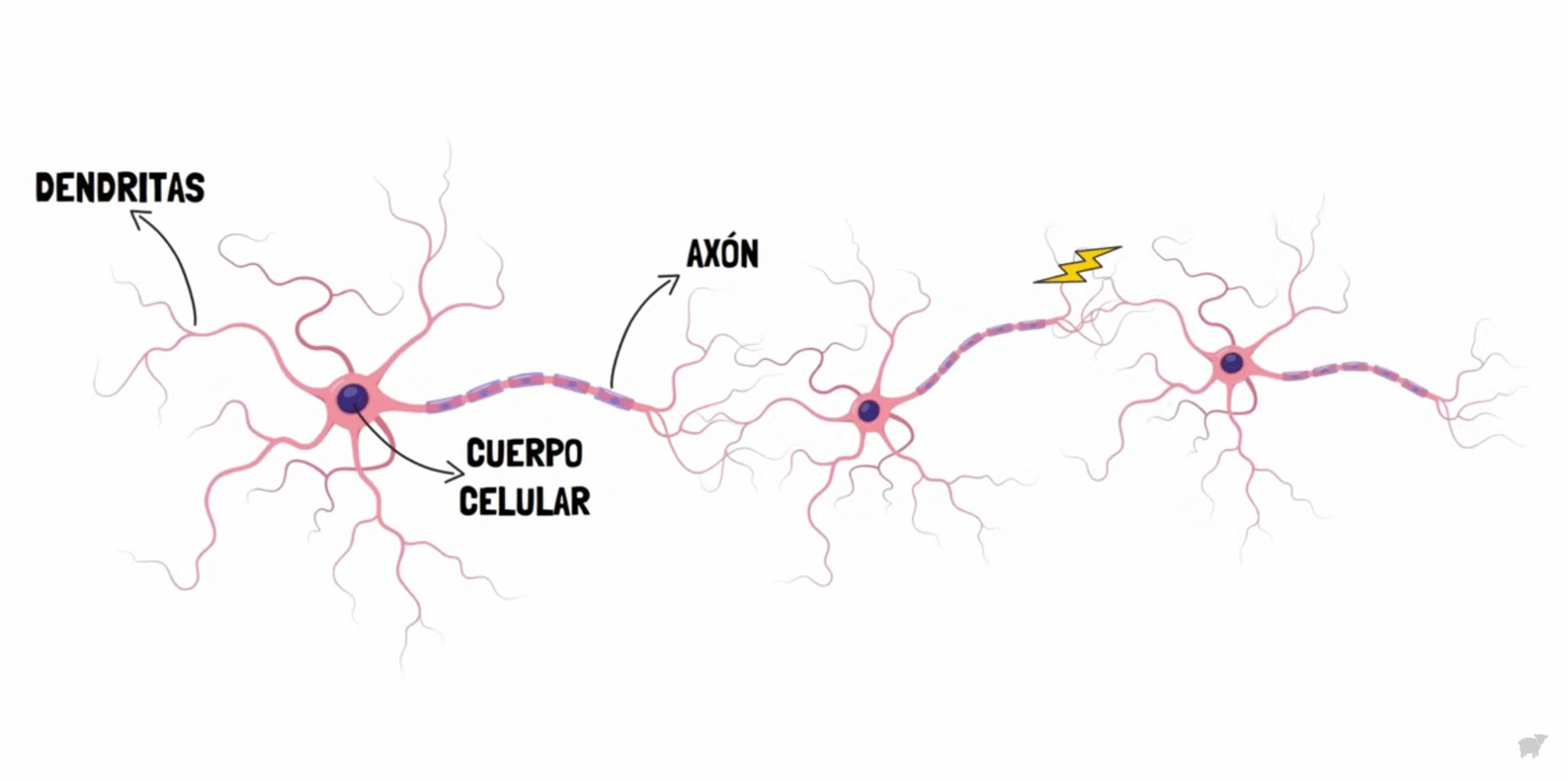 La diferencia entre nuestras dos especies es que las células IPC de Drosophila subobscura producen la proteína Fru M, mientras que las de melanogaster no la tienen. Mediante ingeniería genética, los investigadores hicieron que también hubiera esta proteína en las células de Drosophila melanogaster. Y voilà, con este pequeño cambio, estas moscas también empezaron a regurgitar la comida en la boca de las hembras. Pero, ¿así de fácil? ¿Qué había pasado en la realidad? Las neuronas son células del sistema nervioso que se pueden dividir en tres partes principales: las dendritas, el cuerpo celular y el axón. Las dendritas son pequeñas prolongaciones parecidas a las ramas de un árbol que se conectan con otras neuronas para recibir información. Luego está el cuerpo celular, que procesa esta información, y después el axón, que actúa como un cable de salida transmitiendo la señal a otras células en forma de impulso eléctrico.
