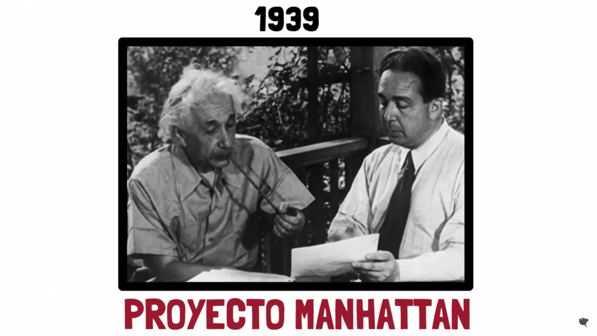 • En los años treinta, el físico Niels Bohr explicó que dividiendo el núcleo de un átomo de uranio podría crearse un arma capaz de arrasar ciudades enteras. Más tarde, el físico húngaro Leó Szilárd, convencido de que Alemania podría hacerse con esta arma, convenció a Albert Einstein para firmar en 1939 una carta dirigida a Roosevelt: nacía así el germen del Proyecto Manhattan.